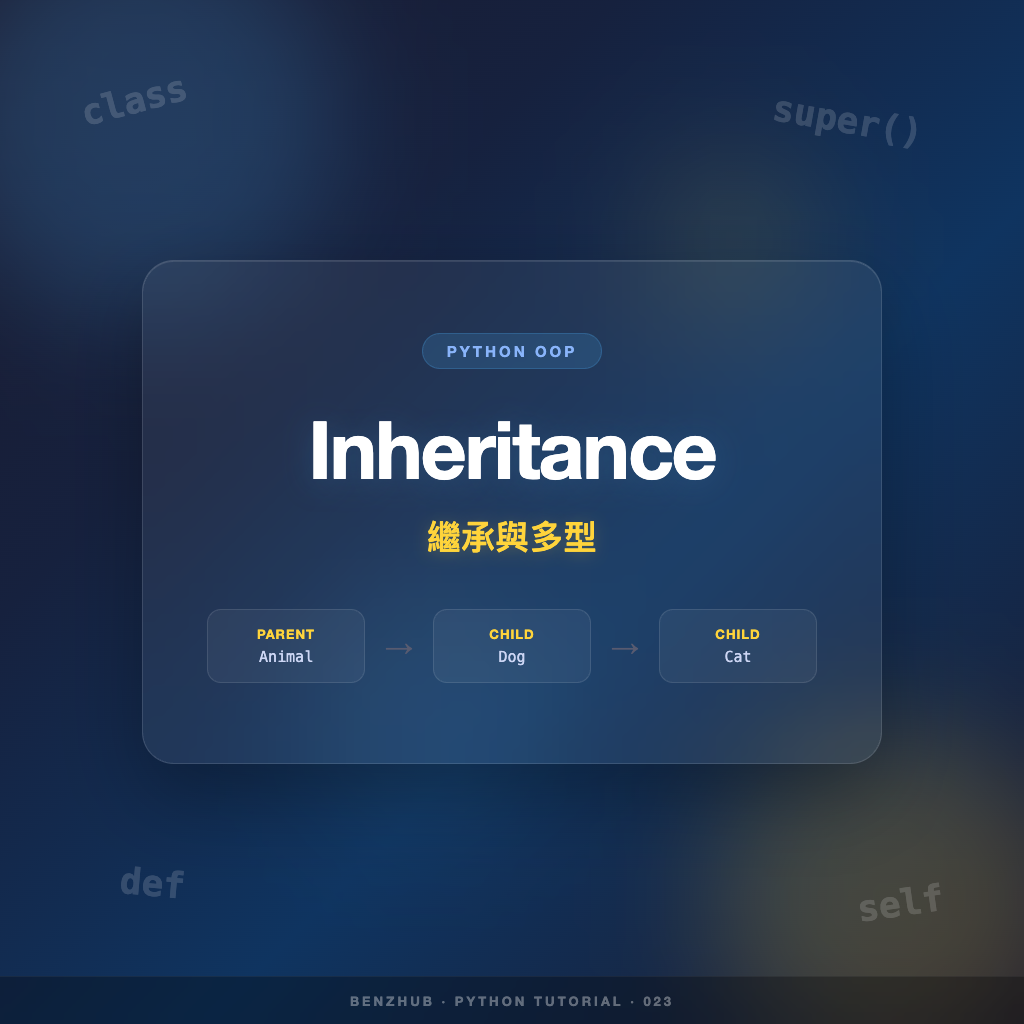 在 Python 的物件導向程式設計中,繼承(Inheritance) 與 多型(Polymorphism) 是兩個核心概念。繼承讓你能夠重用既有的程式碼,而多型讓不同類別的物件可以透過相同的介面來操作。本篇將帶你深入了解這兩個重要的 OOP 特性。